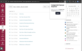 مستورد AssignMint هو ملحق مجاني لمتصفح Chrome يعزز تجربة إدارة الواجبات للطلاب الذين يستخدمون منصة AssignMint. تتيح هذه الأداة للمستخدمين تشغيل سكريبتات تتنقل إلى Canvas، مما يسهل استيراد الواجبات إلى AssignMint.tech بسهولة. تم تصميم واجهته سهلة الاستخدام لتبسيط عملية اختيار واستيراد الواجبات، مما يضمن أن الطلاب يمكنهم البقاء منظمين وعلى اطلاع بمسؤولياتهم الأكاديمية.